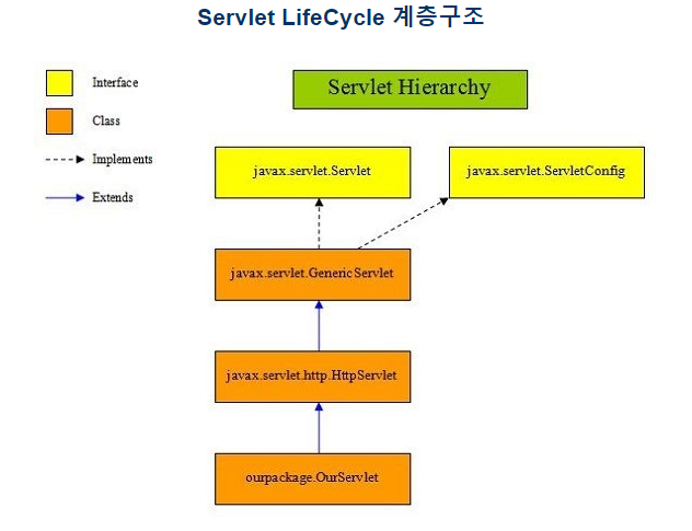 Interface Servlet - abstract class GenericServlet implements Servlet - abstract class HttpServlet extends GenericServlet - 사용자정의 Servlet