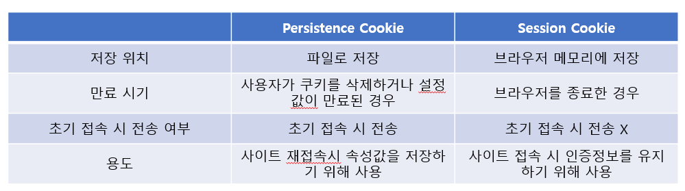 1) setMaxAge() Method의 인자값으로 양수를 지정하면 Persistence Cookie로 저장되며, 지정된 값만큼 Cookie가 유효. 이외의 경우는 전부 Session Cookie로 저장