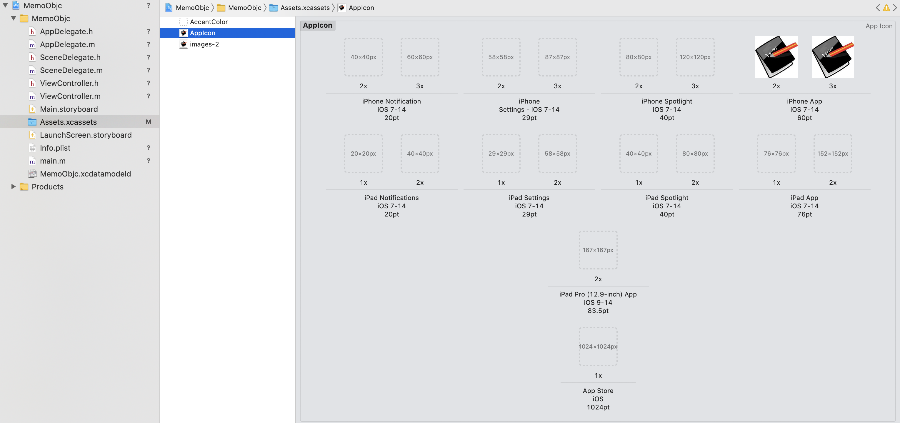 - 아래 그림과 같이 iOS 프로젝트의 Assets.xcassets > Appicon에서 60pt의 2x(120X120), 3x(180X180)에 다운로드 받은 사진을 삽입하여 바탕화면에서 보여질 아이콘을 설정한다