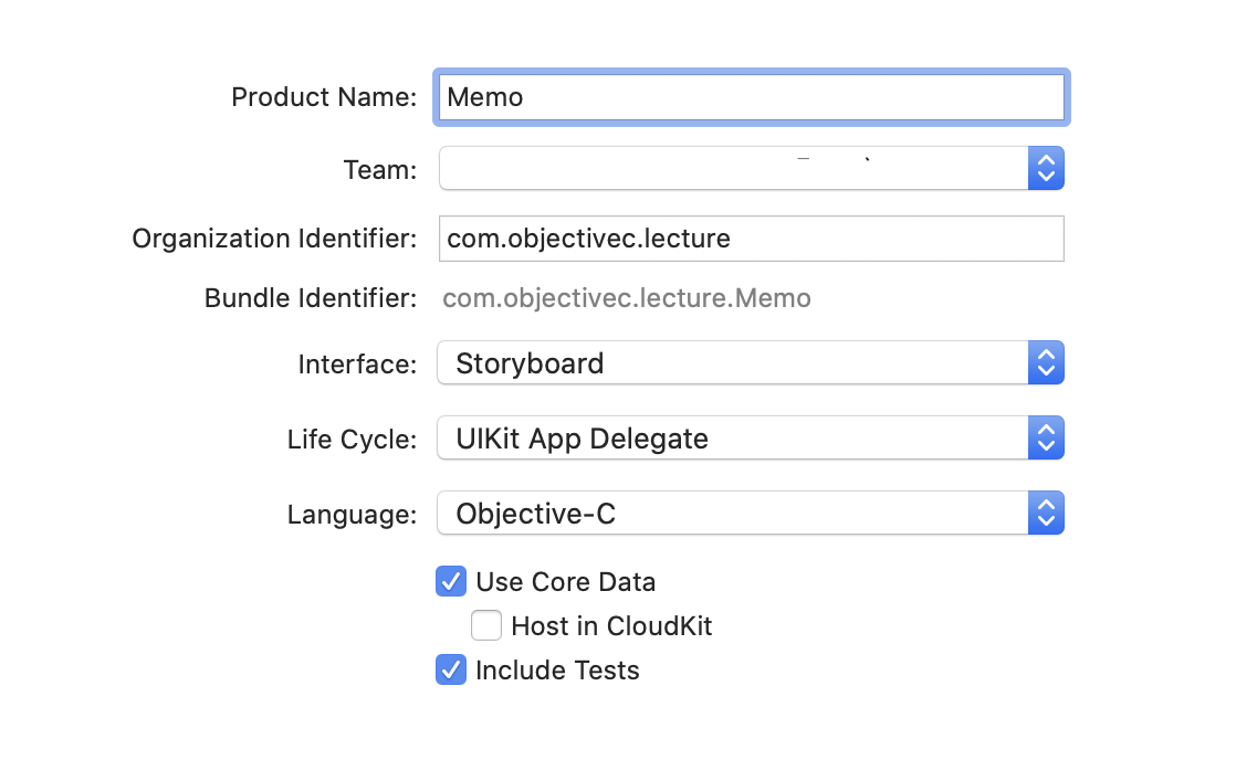 - Use Core Data에 체크를 하여 Core Data에 필요한 기본 코드 자동으로 생성